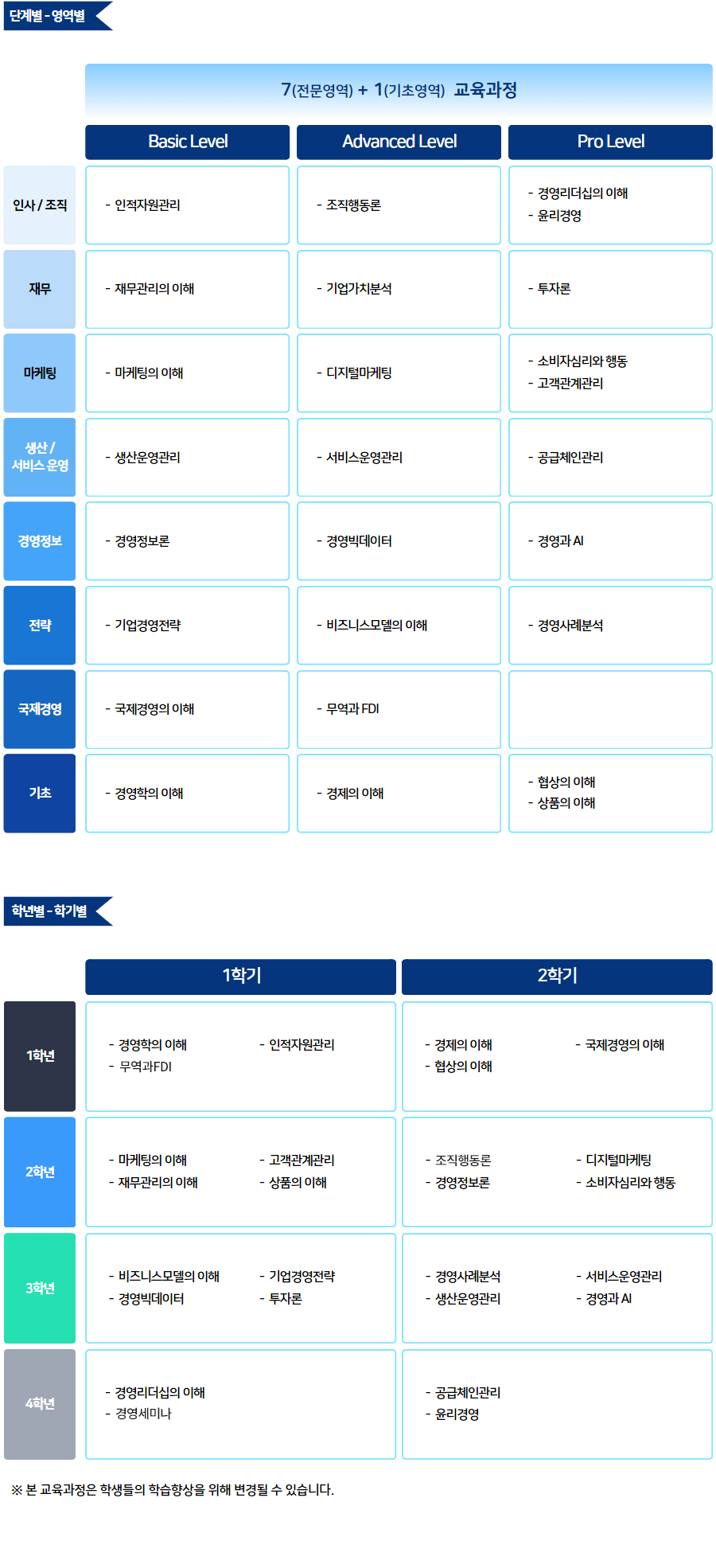 | 3학년 | 1학기 | 비즈니스모델의 이해, 경영빅데이터, 기업경영전략, 투자론 |